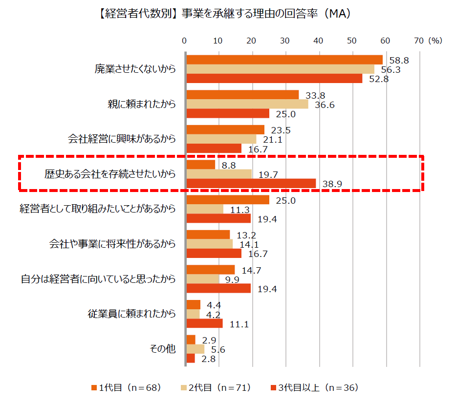 経営者(親御さん)の代数ごとに事業承継をする理由を見たところ、「歴史ある会社を存続させたいから」の回答率は、「1代目」が8.8%に対し、「2代目」では19.7%、「3代目以上」では38.9%でした。