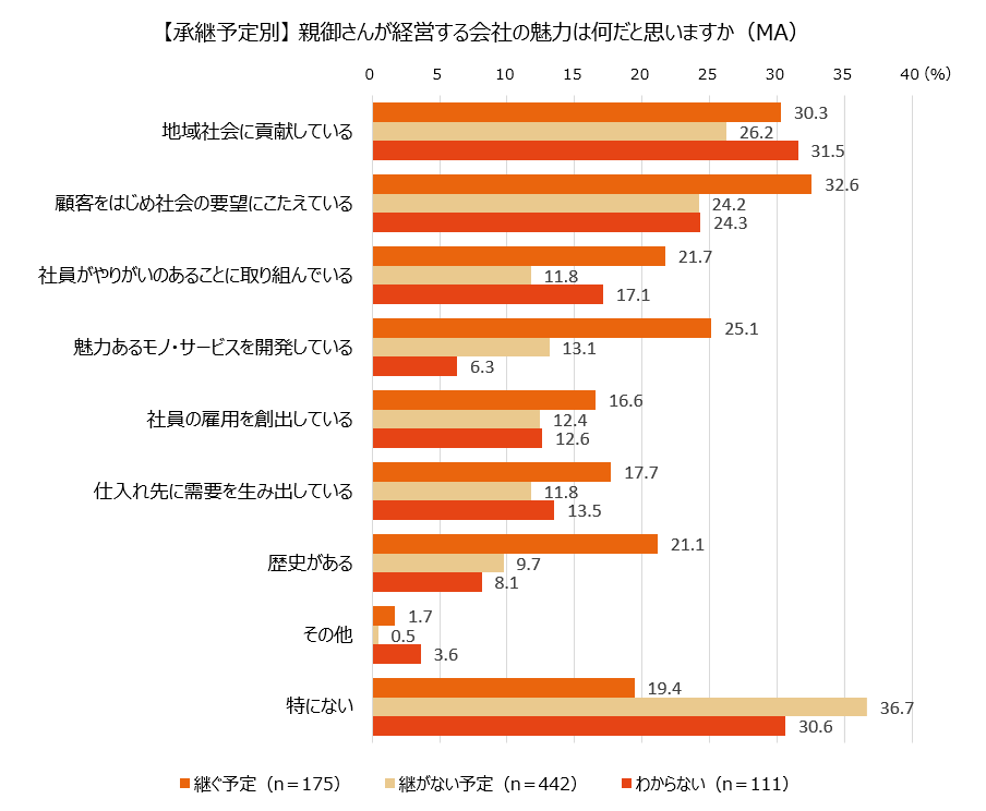 中小企業経営者の息子・娘728名に、親御さんが経営する会社の魅力について聞いたところ、最多は「地域社会に貢献している」で28.0%、次いで「顧客をはじめ社会の要望にこたえている」が26.2%と、社会との関わりについての回答が目立ちました。また、会社事業を「継ぐ予定」と「継がない予定」での回答差を見たところ、全体的に「継ぐ予定」の回答率が高い結果でした。