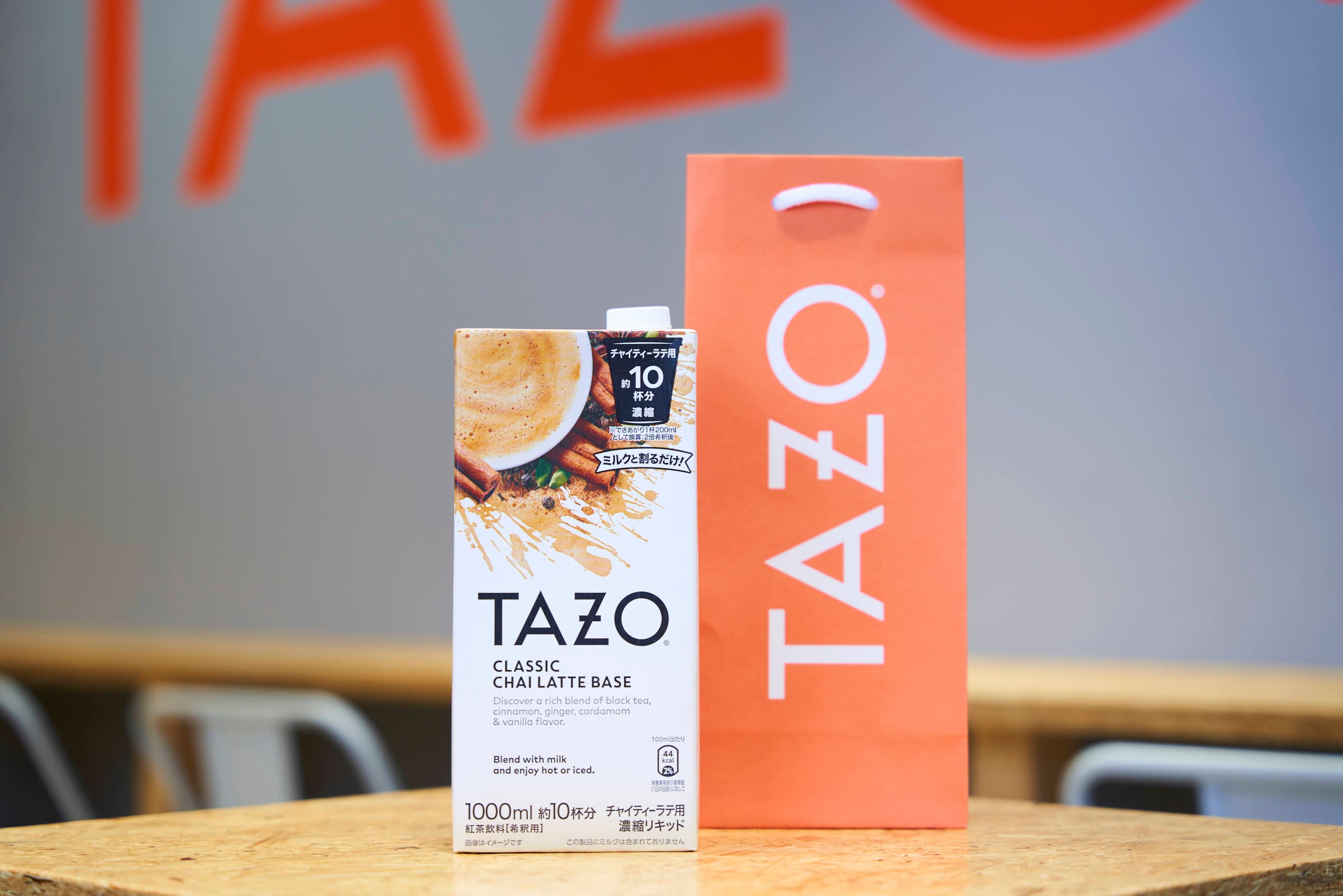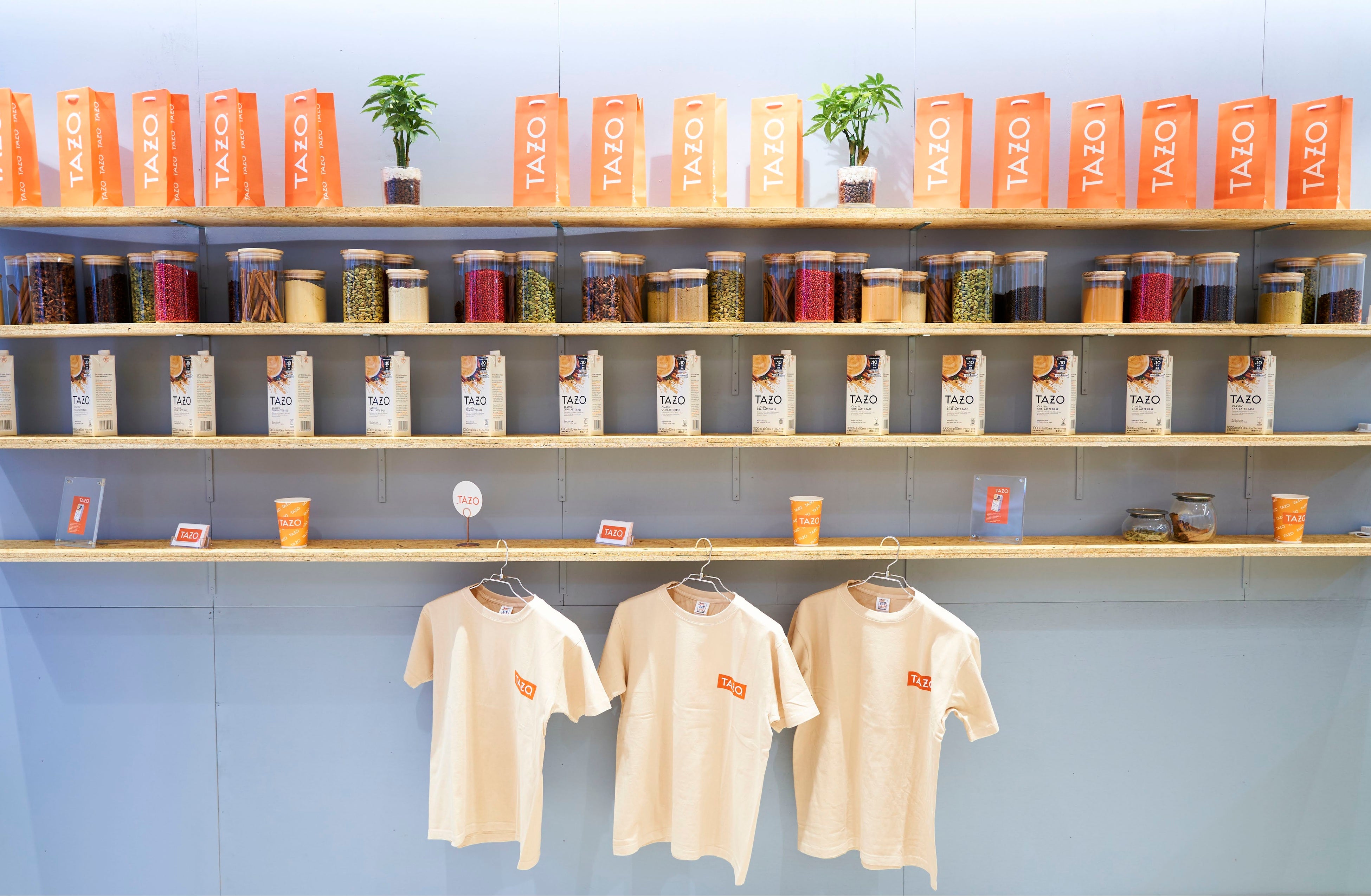■TAZOクラシックチャイティーラテベースラテベースやオリジナルのTシャツが購入できる物販コーナーも併設