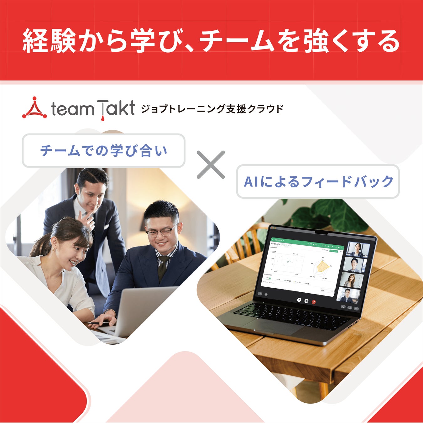 チームタクトは、人・組織の成長支援サービスとして、研修・実務における学びの見える化や、社員同士の学び合いを生む環境醸成、AIを活用した業務の振り返りへのフィードバックなど、独自のメソッドとテクノロジーでこれらの課題解決につながるソリューションを提供しています。
