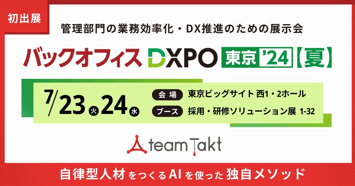 株式会社コードタクト(本社:東京都渋谷区、代表取締役:後藤 正樹、以下「当社」)の人・組織の成長支援クラウド「チームタクト」は、2024年7月23日(火)・24日(水)に東京ビッグサイトで開催する「第3回 バックオフィスDXPO 東京'24【夏】採用・研修ソリューション展」に初出展します。