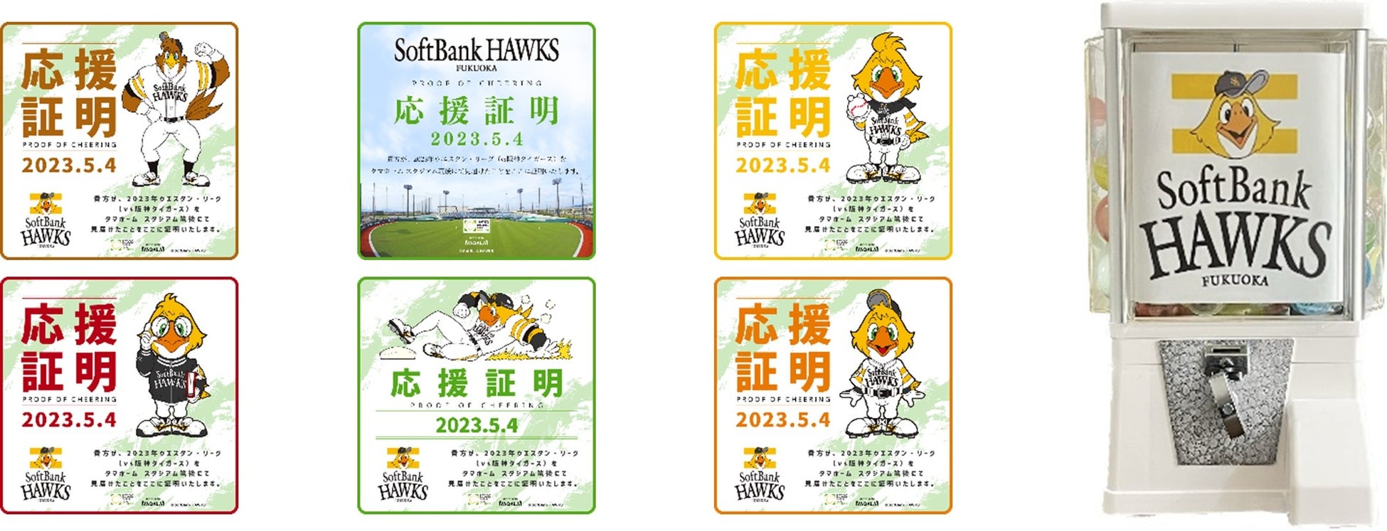 試合当日は、タマホーム スタジアム筑後来場者限定ガチャを開催します。カプセルトイを1人1回無料で回すことができ、カプセルの中には、スマートフォンなどで読み取るとガチャ限定デザインの応援証明が手に入るQRコード、応援証明デラックス版の購入時に使えるクーポンの2つが入っています。デザインは全部で6種類。
