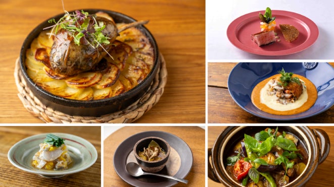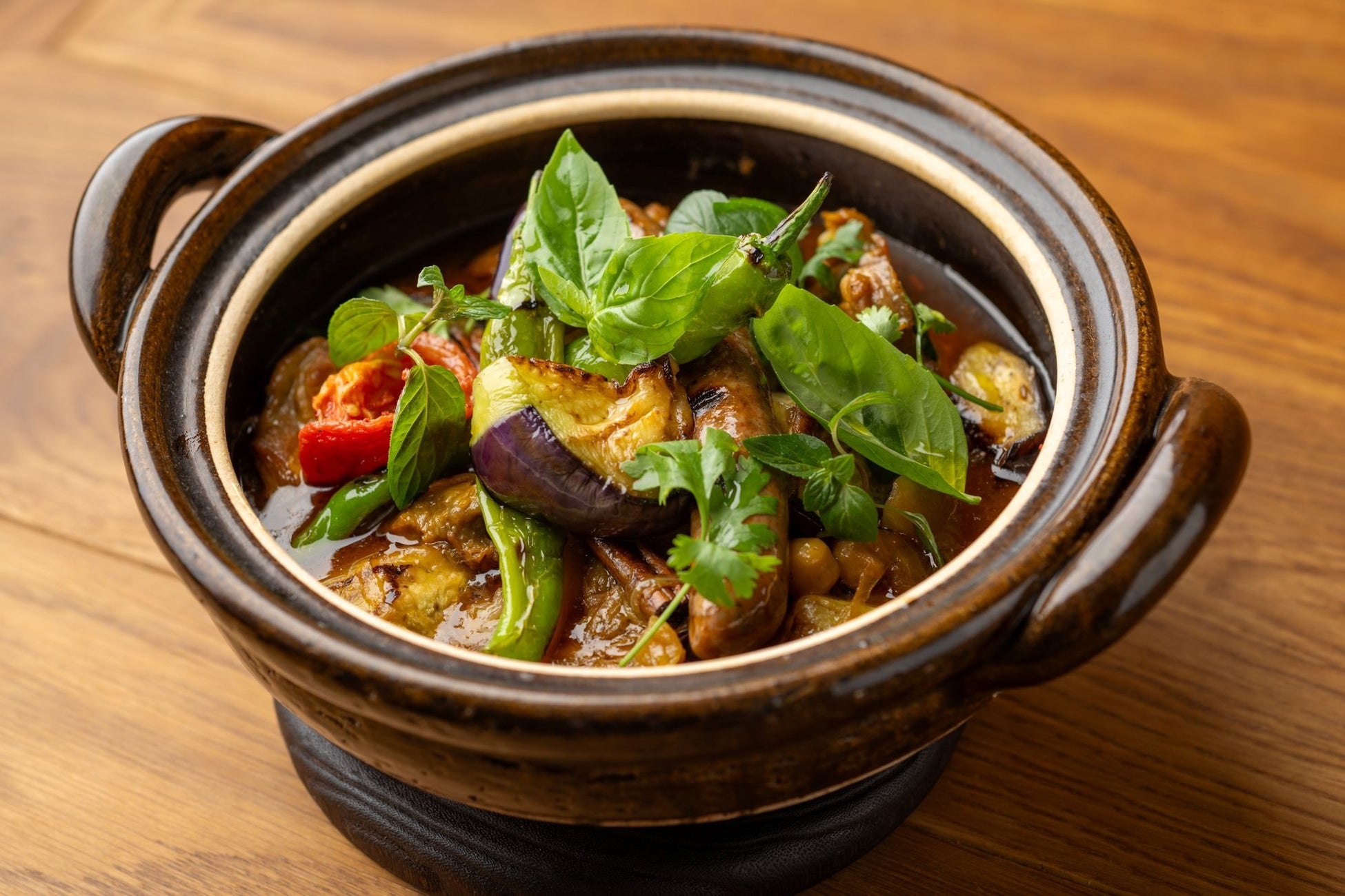 概 要︓吉川ナスと相性抜群の⽺⾁と取り合わせました。サフランやクミンを効かせた⽺⾁の煮込みに、ソテーした吉川ナスをたっぷり加えたタジンは、様々な味わいが渾然⼀体となった異国情緒漂う⼀品です。