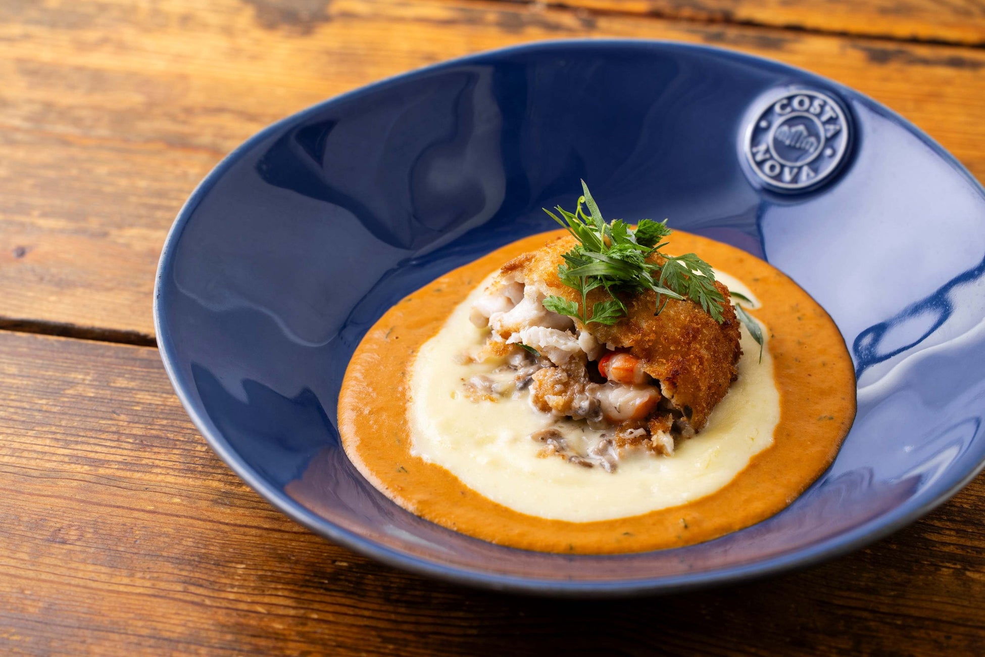 概 要︓⾹り⾼い九頭⻯まいたけのデュクセルと海⽼を、若狭ぐじの⾝で包み、⾐をつけて揚げました。蒸されるように⽕の⼊った若狭ぐじの⾹りとふわふわな⾷感をお楽しみいただけます。