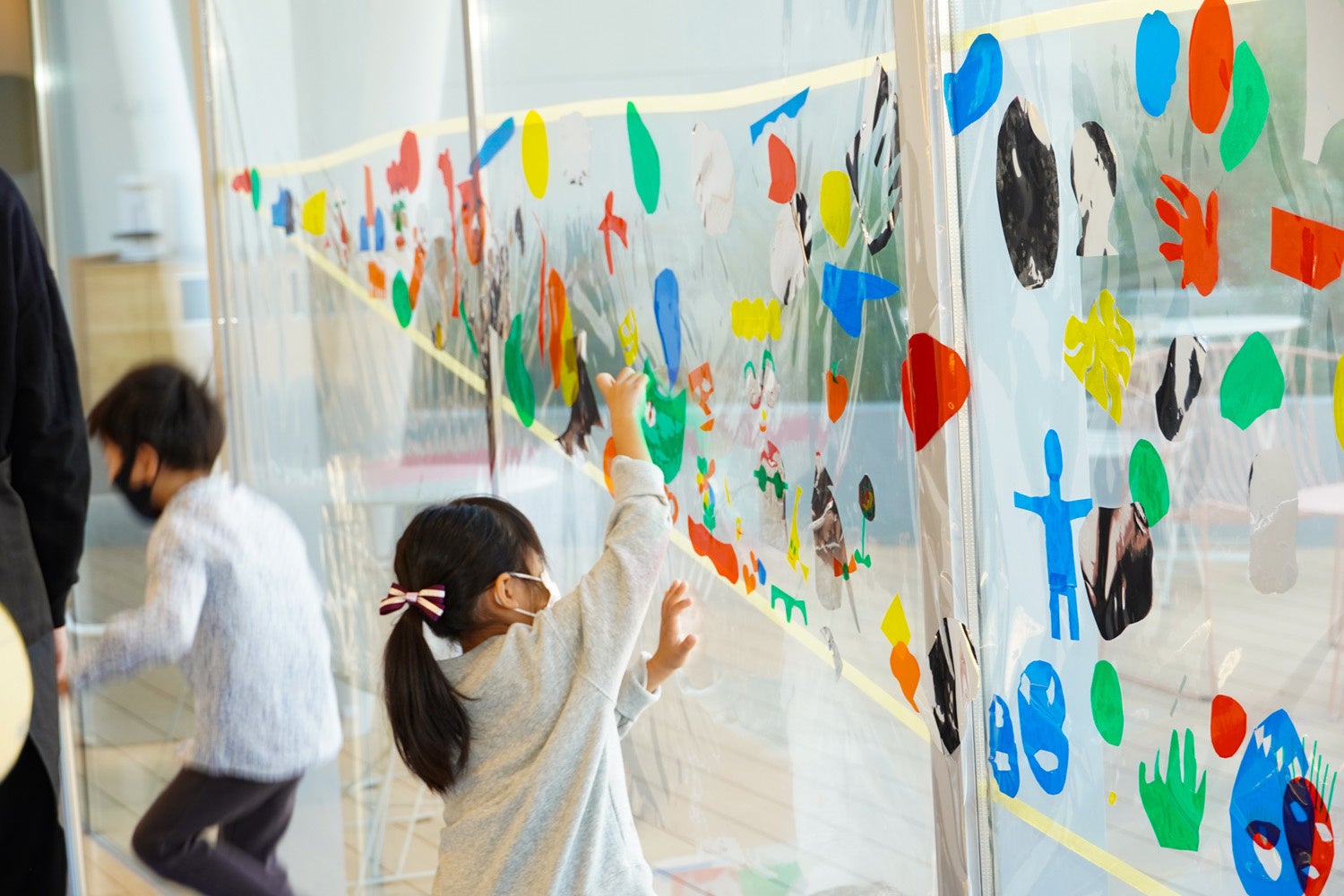 JINS PARKを会場に、高崎市在住で前橋でも精力的に展示をされているアーティスト鬼頭健吾さんと、地域の親子が参加。カラーセロファンに映る“自分の形”をはさみで思い思いに切り取り、窓ガラスに貼っていくことで、大きなひとつの作品をつくりました。