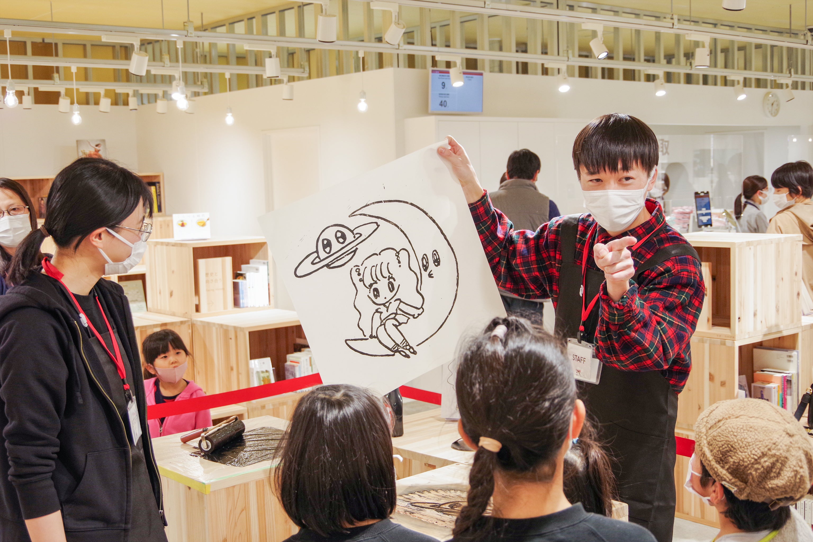 JINSイオンモール岡崎店を会場に、名古屋市を拠点に活動されている現代美術ユニット「温田山」の山下拓也さんを講師に招き、地域の親子が参加。子どもたちは、山下さんが事前に彫った3つの木版を組み合わせて、自分だけの作品を制作。“見る”世界が反転する、という版画ならではのおもしろさを体感しました。
