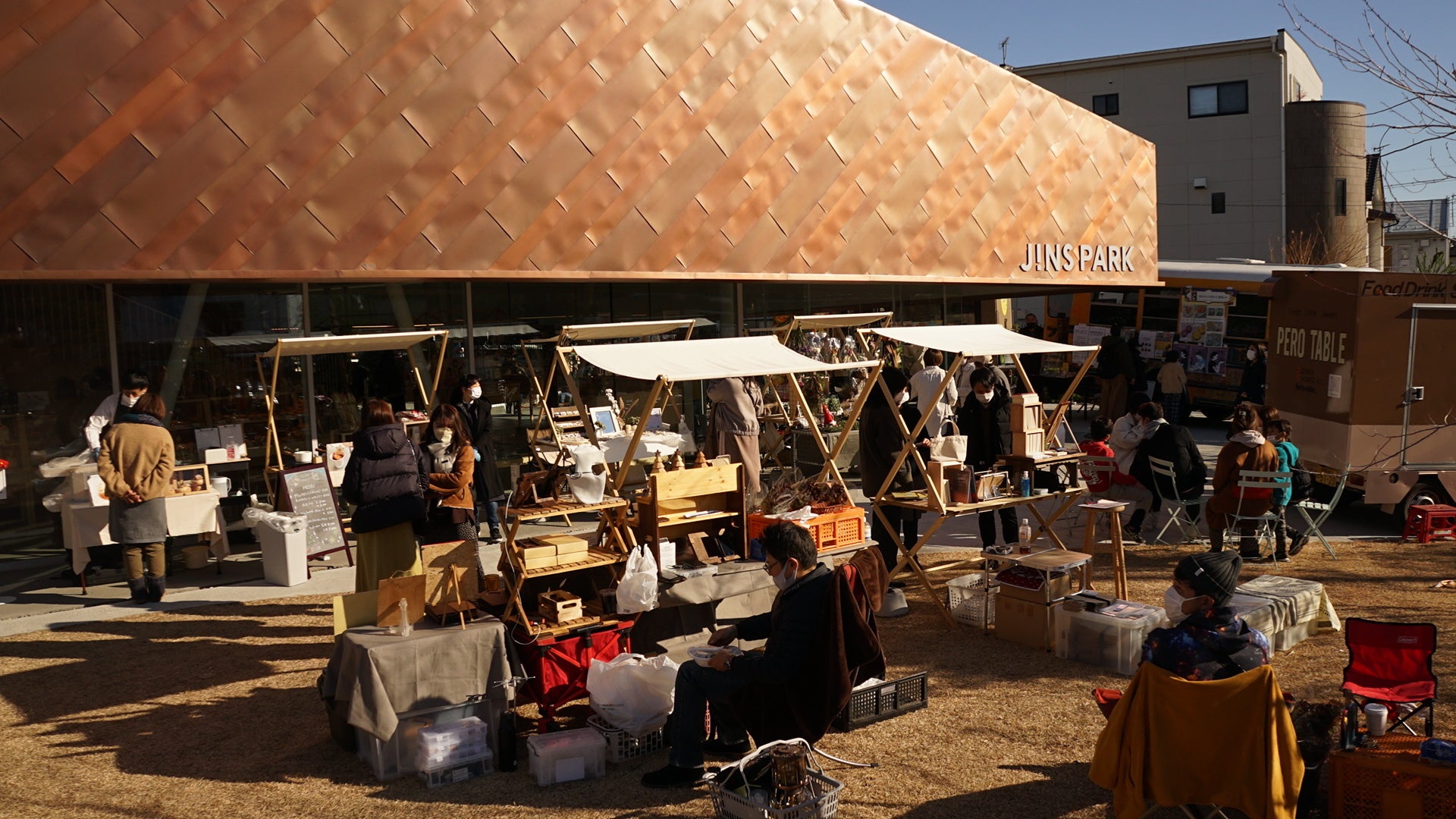 クリスマス仕様に飾り付けたJINS PARKで、家族でも楽しめるホリデーマーケットを開催。地元で活動しているクラフト作家の方々による雑貨販売やキッチンカーの出店に加え、JINSでもメガネケースデコレーションのワークショップを無料で実施し、地域のイベントとしてたくさんのお客様にお越しいただきました。