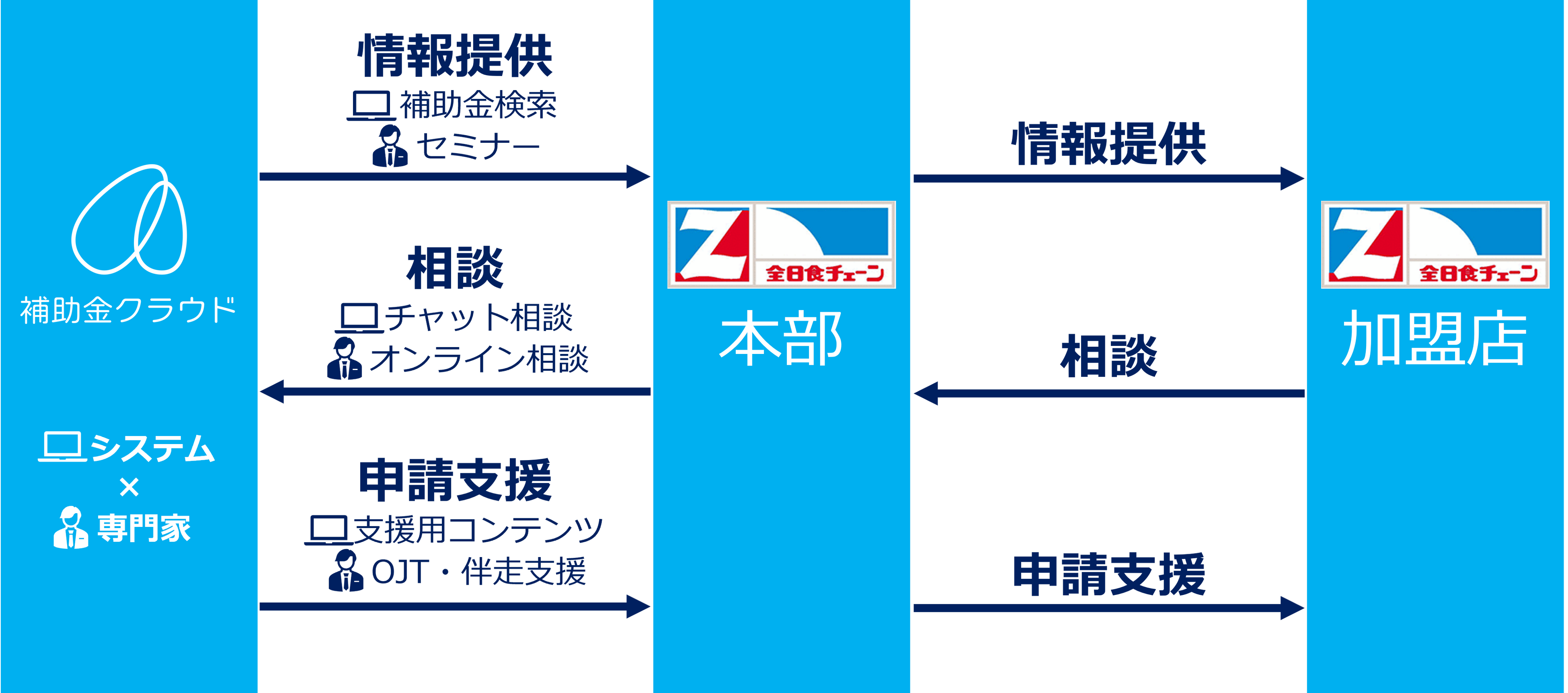全日本食品では、これまでも加盟店の補助金活用を支援してきましたが、リソースやノウハウが不足しており、対応できる補助金が限定されておりました。