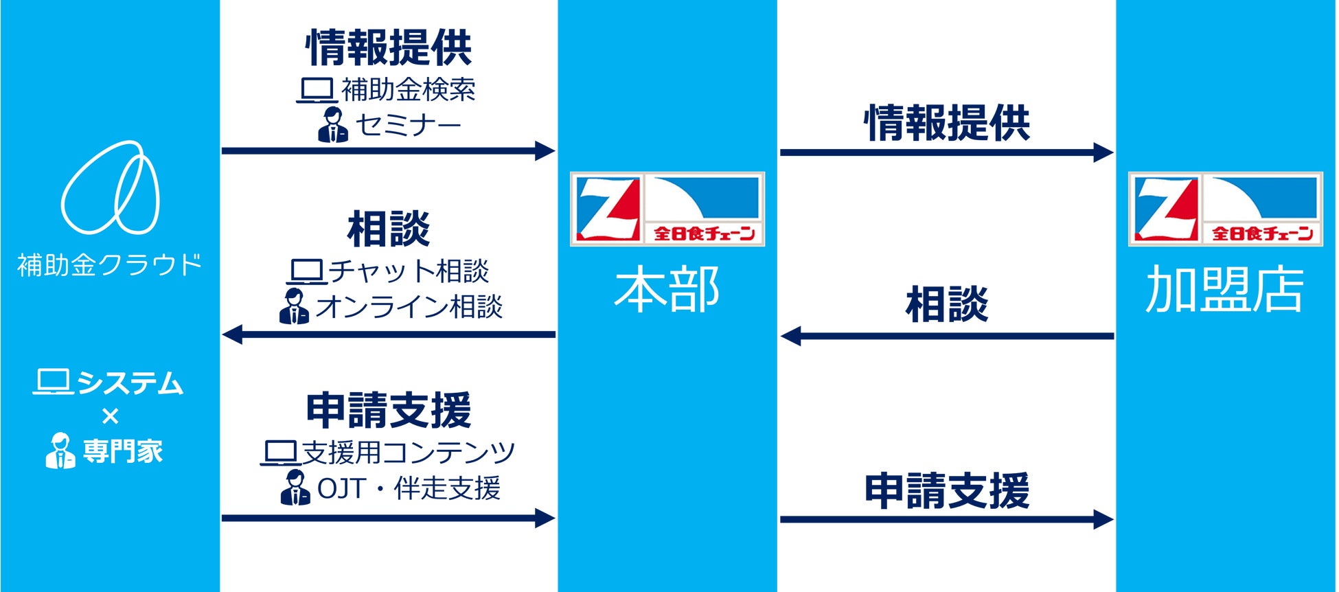 「補助金クラウド」導入、及び両社の提携に伴い、加盟店向けの補助金セミナーを共同で開催し、設備投資に活用可能な補助金の認知や興味関心の向上を図ってまいりました。また、補助金相談窓口を設けて、加盟店からの相談に応じております。その結果、加盟店からの補助金活用の相談の増加や、全日本食品のスーパーバイザーと加盟店の日々のやり取りの中で補助金活用の話が積極的に行われるようになるなど、補助金活用を中心とした経営支援の体制構築が進んでおります。実際に全日食チェーン加盟店であるファミリーストアみやとらにおいて、IT導入補助金の採択に至るなど、さらに支援を拡大することを目指し取り組みを強化しております。