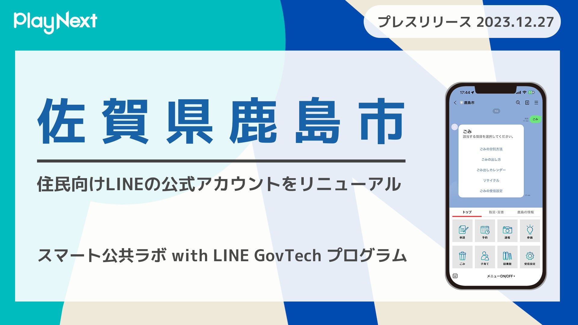 プレイネクストラボ株式会社(本社:東京都品川区、代表取締役:柏 匠、以下 「プレイネクストラボ」)は、合同会社DMM.com(本社:東京都港区、会長 兼 CEO:亀山敬司、以下「DMM」 )との協力により、佐賀県鹿島市(以下「鹿島市」)のLINE公式アカウントを「スマート公共ラボ with LINE GovTechプログラム」を活用してリニューアルし、2024年1月1日(月)より一般公開することをお知らせします。