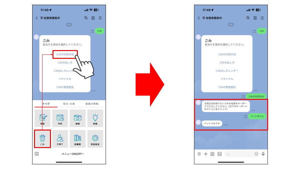 特に基本メニューの「ごみ」→「ごみの分別方法」からは、ごみの分別方法を検索することができるようになります。分別方法を知りたいごみの品目をキーボードから入力すると、分別方法が自動返答されます。ごみの分別方法に迷った際にも、LINE公式アカウントのチャットボット機能を活用できます。