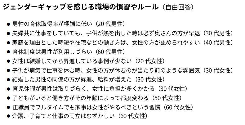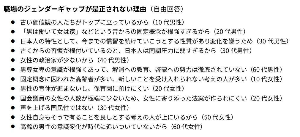 - ジェンダーギャップが是正されない理由を自由回答で尋ねたところ、「保守的」「同調圧力が強く、声を上げづらい」「古くからの慣習」などの声が散見された。