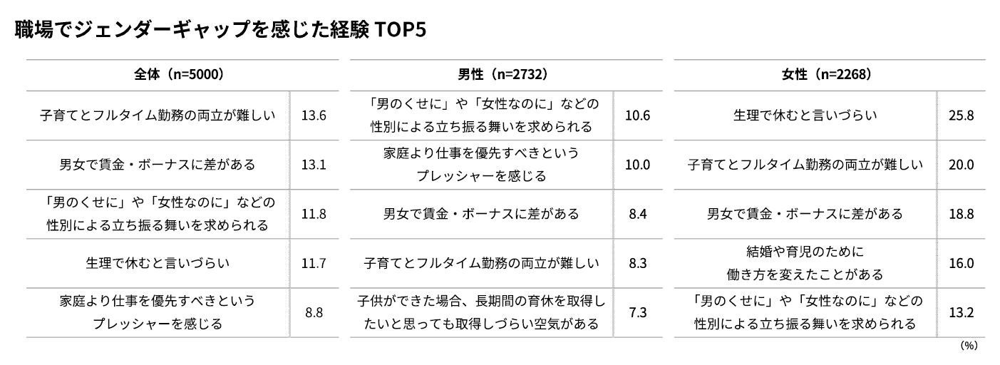 - 職場でジェンダーギャップを感じた経験TOP3は、1位「子育てとフルタイム勤務の両立が難しい」(13.6%)、2位「男女で賃金・ボーナスに差がある」(13.1%)、3位「男のくせに、女性なのに、などの性別による立ち振る舞いを求められる」(11.8%)。女性では「生理で休むと言いづらい」(25.8%)が最も多かった。