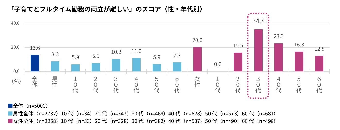 - 職場でジェンダーギャップを感じた経験1位の「子育てとフルタイム勤務の両立が難しい」を性・年代別に見ると、30代女性が34.8%と最も高い。