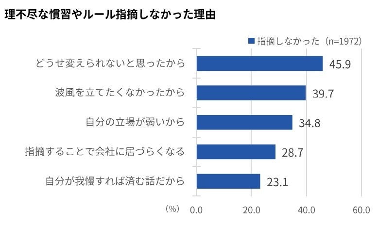 - 理不尽な慣習やルールに対して指摘できなかった理由や行動しなかった理由を見ると、「どうせ変えられないと思ったから」(45.9%)、「波風を立てたくなかったから」(39.7%)、「自分の立場が弱いから」(34.8%)といった、諦めの姿勢や同調圧力によるものが上位を占めた。