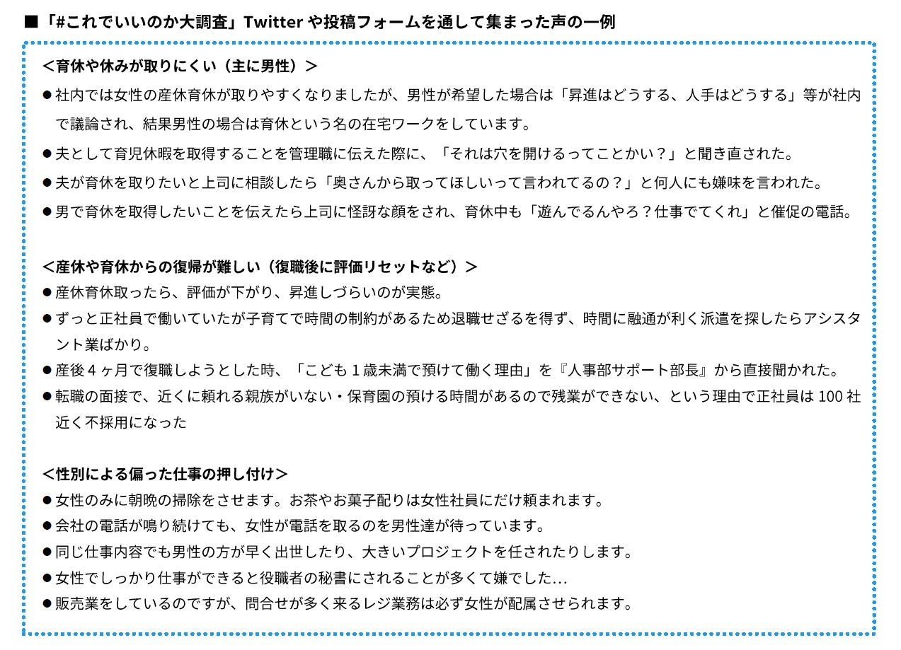「ハロー、ニュールール!」キャンペーンの第一弾として、日本の職場のジェンダーギャップのリアルな実態を把握するために、働く上でのジェンダーに関する違和感を日本全国から募集する「#これでいいのか大調査」を実施しました。バカボンのパパお馴染みのセリフ「これでいいのだ」ではなく、あえて「これでいいのか?」の問いかけを 発することで、日本全国の働く人のジェンダーギャップやジェンダーに関する違和感などの生の声が集まりました。
