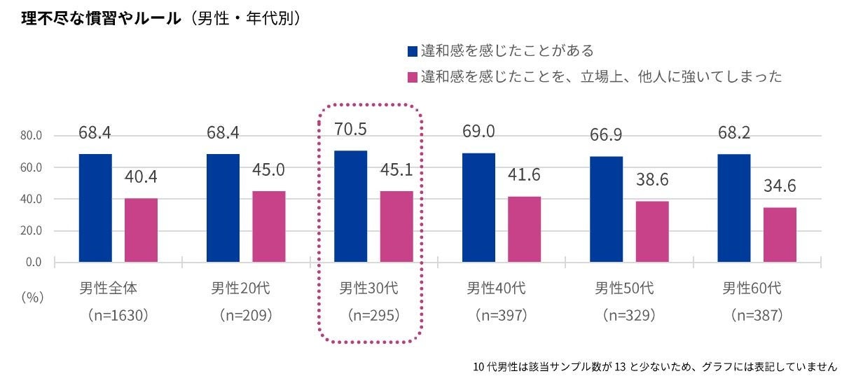 - 理不尽な慣習やルールを指摘できなかった経験を年代別で見ると、30代が最も多く64.6%に上った。 さらに性別で見ると、30代男性は、7割が「理不尽な慣習やルールに違和感を感じたことがある」(70.5%)と回答している一方で、「立場上、他人に強いてしまった」経験も45.1%と最も多い結果となった。