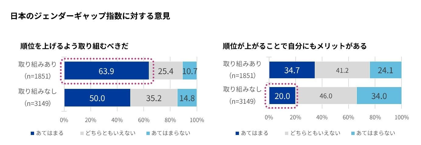 - 日本のジェンダーギャップ指数の順位※に対して、「職場でジェンダーギャップ改善の取り組みがある層」は「改善の取り組みがない層」と比べ、「順位を上げるように取り組むべき問題だと思う」と回答した人の割合が13.9ポイント高く、「順位が上がることでメリットがある」と回答した人の割合が14.7ポイント高い結果となった。