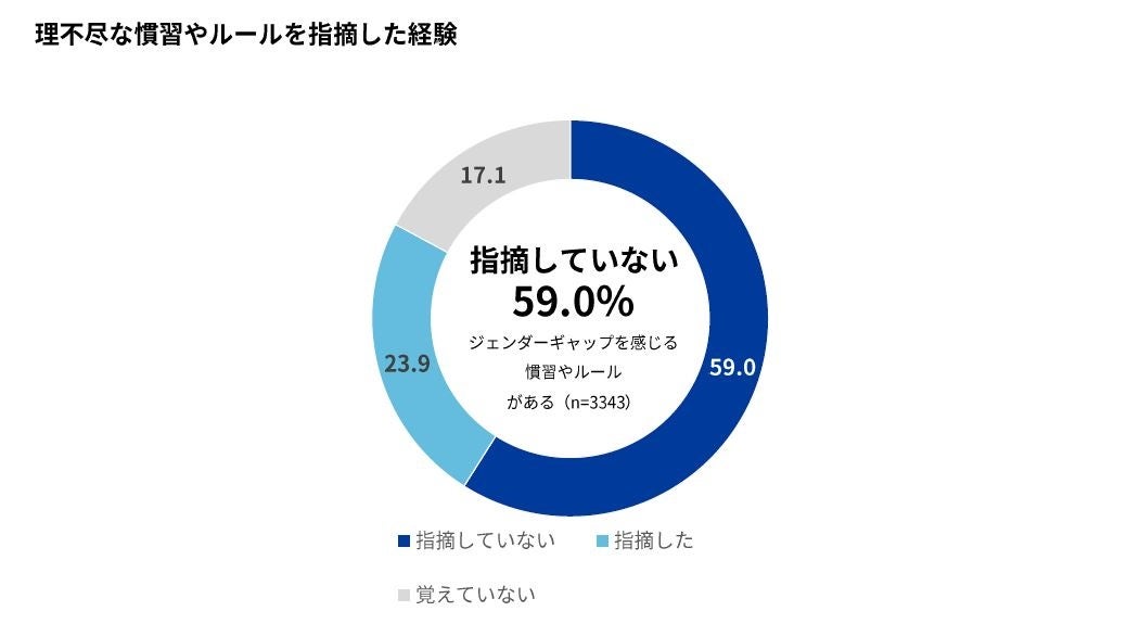 - ジェンダーギャップを感じる職場の慣習やルールがあると回答した3,343人のうち、理不尽な慣習やルールを 指摘できなかった経験のある人は約6割(59.0%)。