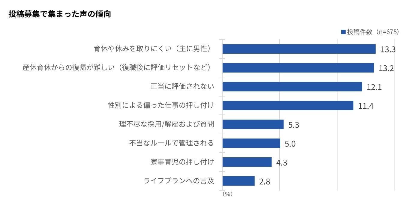 - 投稿募集で集まった声(675件)を集計すると、職場でジェンダーギャップを感じた内容として「育休や休みを取りにくい(主に男性)」(13.3%)、「産休育休からの復帰が難しい」(13.2%)の二つに関連した投稿が多く、次いで「(性別によって)正当に評価されない」(12.1%)、「性別による偏った仕事の押し付け」(11.4%)に関連した投稿が多い結果となった。