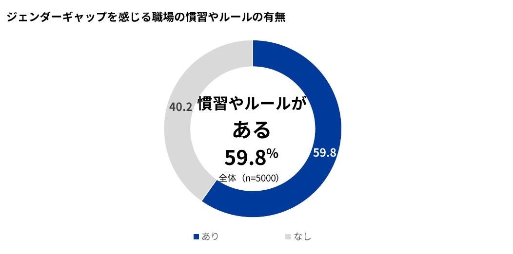 - 59.8%が、ジェンダーギャップを感じる職場の慣習やルールがあると回答。TOP3は、1位「男性の方が昇進しやすい」(18.5%)、2位「男性の方が責任ある仕事を任される/リーダーになりやすい」(16.5%)、3位「男性は長期(1ヶ月以上)の育休を取得しづらい空気がある」(16.4%)。
