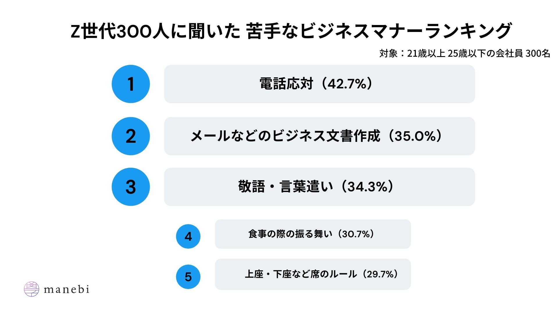株式会社manebi(東京都千代田区、代表取締役執行役員CEO:田島 智也)は、Z世代(21歳以上 25歳以下)の会社員300人を対象に、「ビジネスマナーに関する調査」を実施しましたのでお知らせいたします。