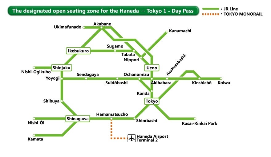東京モノレール(羽田空港駅から浜松町駅までの片道)及び東京都区内(東京都23区と同じ範囲内)のJR東日本在来線の普通列車の普通車自由席が1日乗り降り自由となる企画乗車券「都区内パス」があらかじめセットされています。