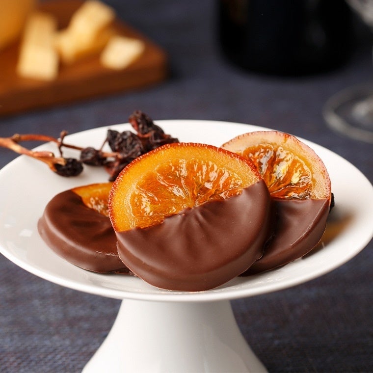 ジューシーな バレンシアオレンジのコンフィに、55%カカオのビターチョコレートを組み合わせたスイーツ。