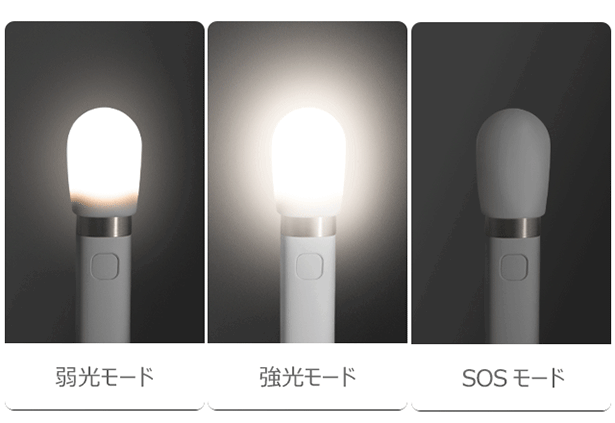 本体のボタンを約1.5秒長押しすることで電源オン。場面によって、三段階の光モードを切り替えられて実用性満点です。SOSモードは強い光が1~2秒間隔で点滅。遭難信号灯としても代用可能。