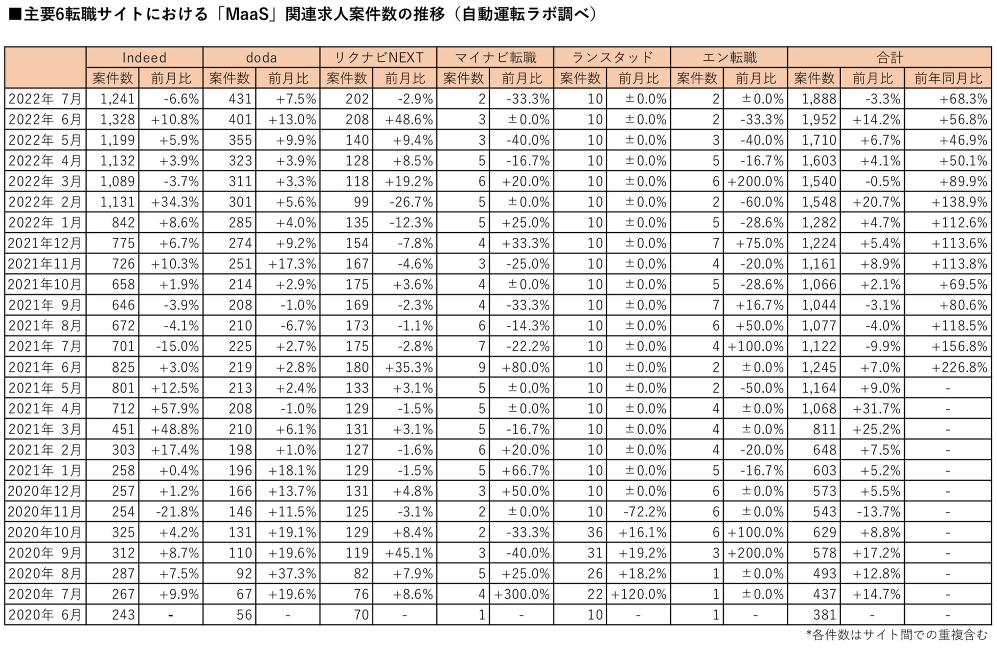 「MaaS」の関連求人案件数(主要転職6サイト)は2022年7月末時点で、前月比3.3%減、前年同月比68.3%増の1,888件となりました。調査開始以来、前年同月比での増加が続いています。