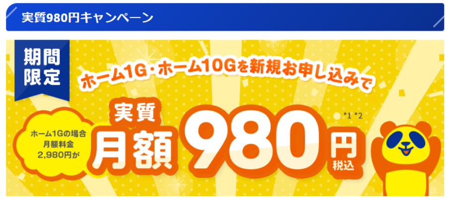通常のキャッシュバックキャンペーンのキャッシュバック金額はホームタイプの場合で30,000円ですが、「実質980円キャンペーン」をご利用いただくことでキャッシュバック金額は合計40,000円になるため、今よりもお得にお申し込みいただけます。