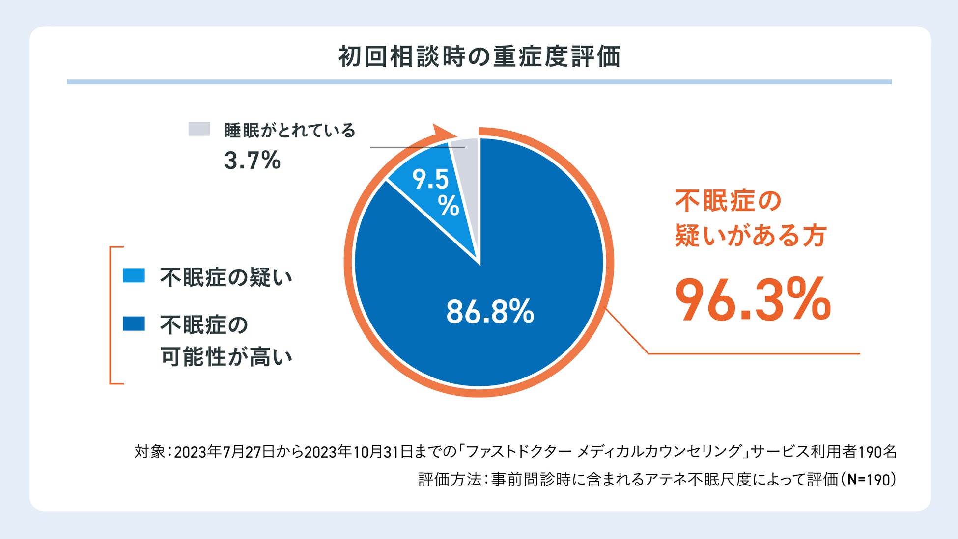 ファストドクターはこれまでにも、オンラインで初診から診療が可能な「メンタルクリニック」や、認知行動療法を指導する「メディカルカウンセリング」などのサービスを提供してきました。「メンタルクリニック」で不眠症/睡眠障害の診断を受けた、あるいは疑いのある患者は2割を超え、最も多い疾患*4であることがわかっています。加えて、「メディカルカウンセリング」では、利用者の9割に不眠症の疑いがあるとされ、利用者の多くが睡眠に問題を抱えていることが明らかになりました。これらの結果は、メンタル不調と睡眠の深い関係性を示唆しています。