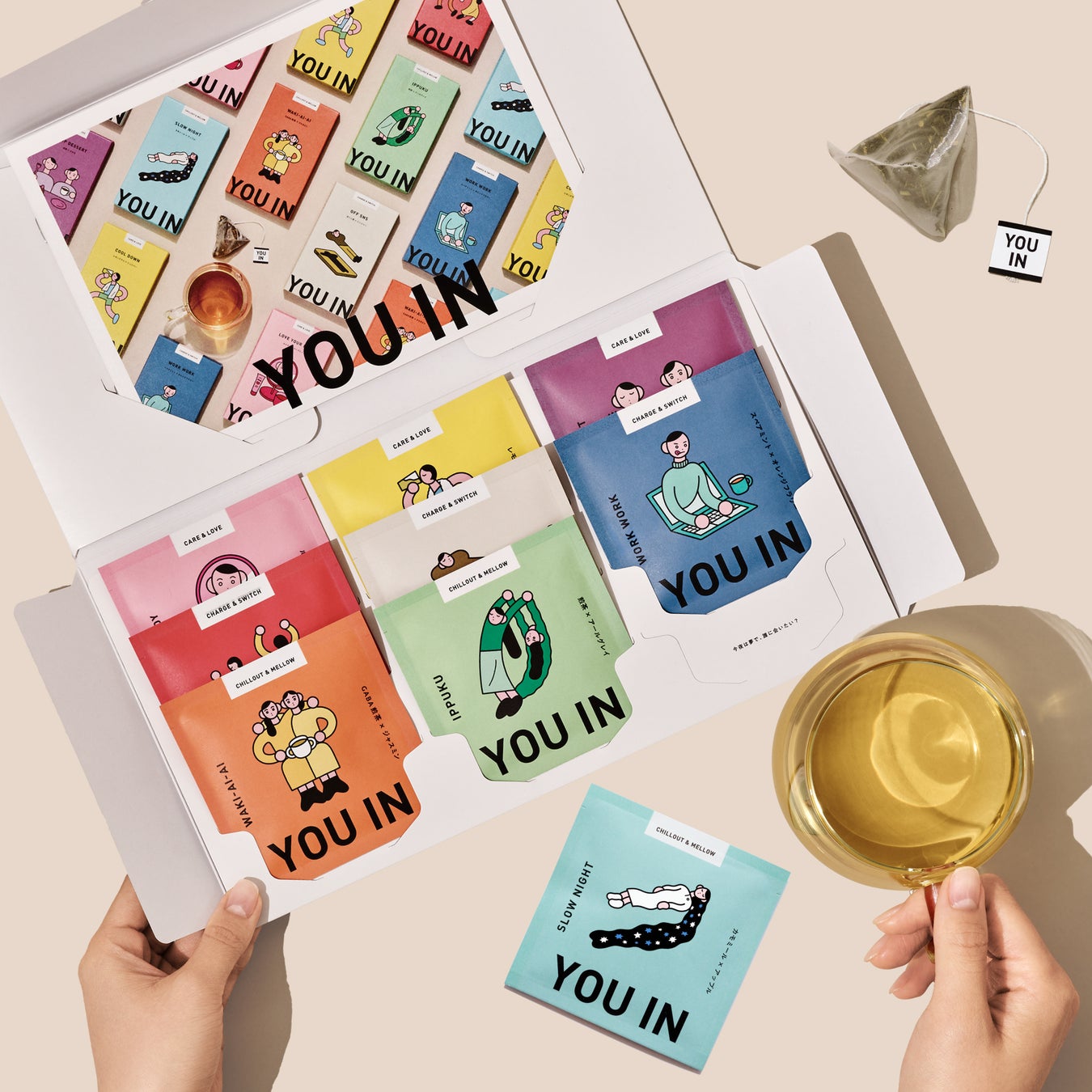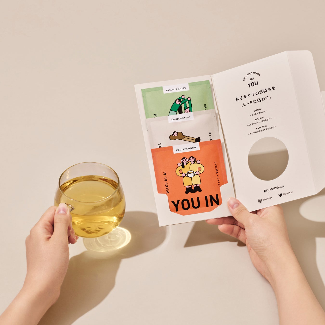「YOU IN」は、気分やシーンに合わせる『ムードペアリング』を通して、今その瞬間の気分や状態に向き合い、寄りそい、肯定する、そんな体験を提案するウェルネスライフブランド*です。陽なときも陰なときも、日常の些細なひとコマから、ちょっと特別なひと時まで。この地で育まれた文化や歴史と共に、その瞬間を大切に思えるようなプロダクトを届けています。