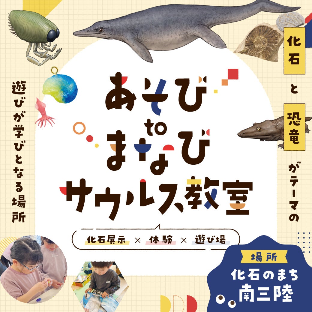 新たに出現する「化石」と「恐竜」をテーマとした全天候型プレイルーム「サウルス教室」。教室の名称の示す通り「遊び」にとどまらず、約2億5千万年前の古生物学の概説・町産出の化石展示・化石にまつわるワークショップも組み込まれており、「遊びが学びとなる場所」づくりを目標に展開します。会場は「道の駅さんさん南三陸・南三陸ポータルセンター」。土曜日・日曜日に不定期開催を予定中であり、5月3日(土)~5月5日(月)のゴールデンウィーク(GW)の3日間に初開催されます。