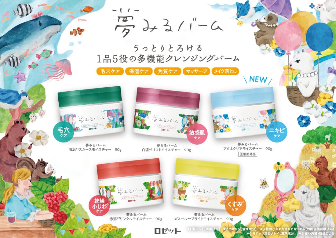ロゼット株式会社は、1品5役の多機能クレンジングバーム『夢みるバーム』から、「海泥*1スムースモイスチャーハーフサイズ 45g」と「アクネクリアモイスチャー ハーフサイズ 45g」を数量限定で新発売。2023年3月2日(木)より全国のドラッグストア、バラエティショップ(※一部店舗除く)、ロゼットの通信販売・各公式オンラインショップにて販売を開始いたします。(*1 海シルト〔清浄成分〕)