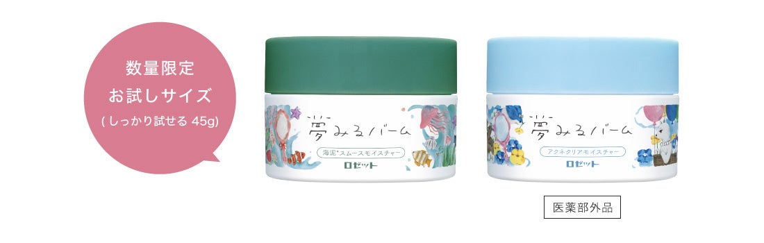 2020年9月に初登場して以来、SNSを中心に人気を集め、幅広い世代からご愛用いただいている『夢みるバーム』。うっとりとろける感触や肌悩みもケアできるその魅力を、より手軽にお試しいただける45gのハーフサイズ(通常品は90g)を数量限定でご用意いたしました。ラインナップは、毛穴対策で人気の「海泥*1スムースモイスチャー」と、大人ニキビ対策の新商品「アクネクリアモイスチャー【医薬部外品】」の2種。持ち運びしやすいサイズ感でありながらしっかり試せるハーフサイズ(45g)は、旅行やお出かけ時の携帯品としてはもちろん、初めて使う際のお試し品として、またプチギフトなどのプレゼント品など、さまざまなシーンで幅広くご活用いただけます。