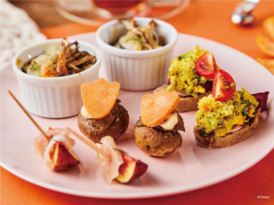 ドナルドダックの足型のにんじんを乗せたマッシュルームミートボール、お豆と舞茸のミニグラタン、かぼちゃと海老のタルティーヌ、季節の果物と生ハムなどお食事メニューを楽しめるプレートです。