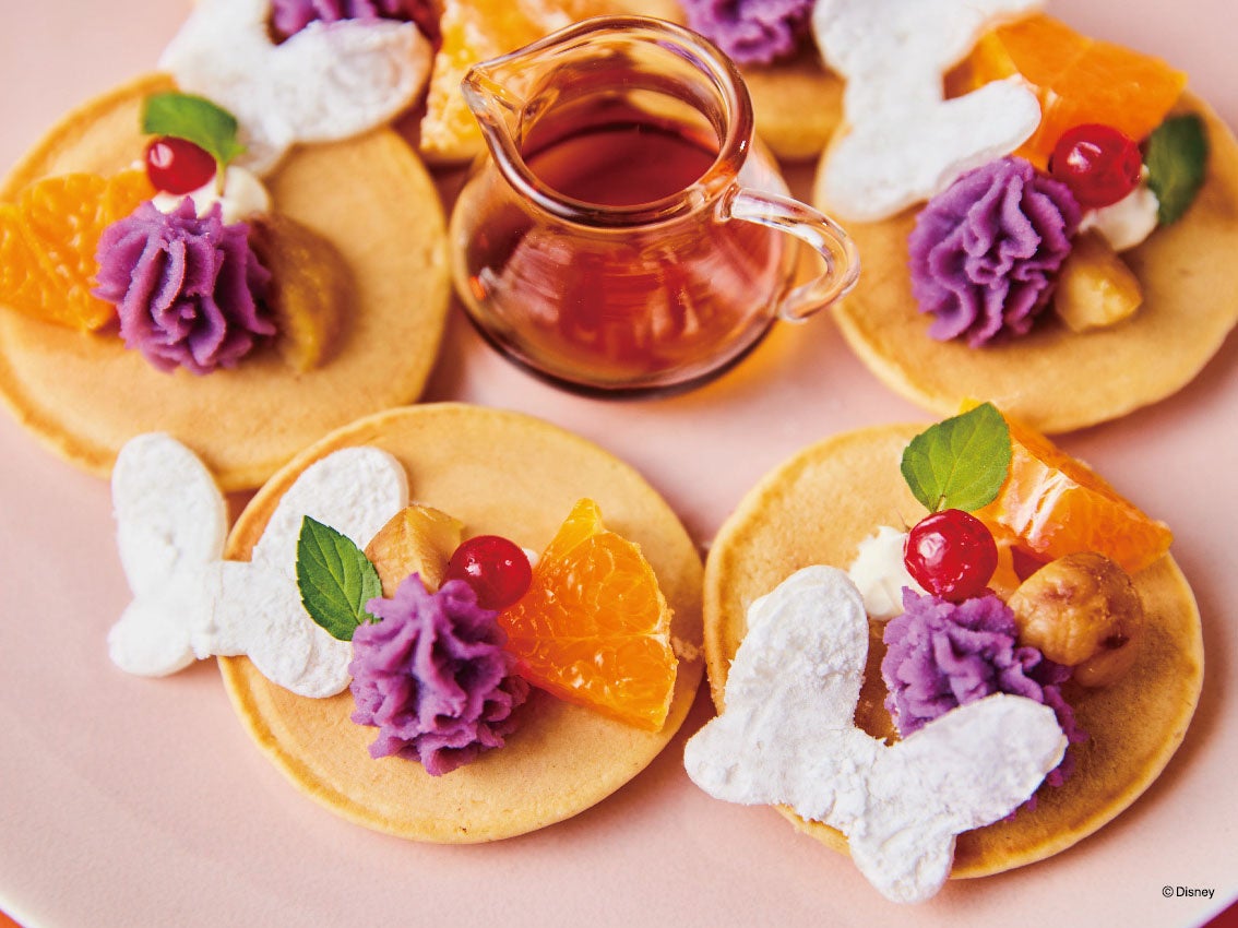 オリジナルのオートミールパンケーキをミニサイズにし、紫芋とさつまいものクリームに季節のフルーツとデイジーダックのリボン型求肥をあしらったカラフルパンケーキ。メープルシロップをかけて召し上がれ。