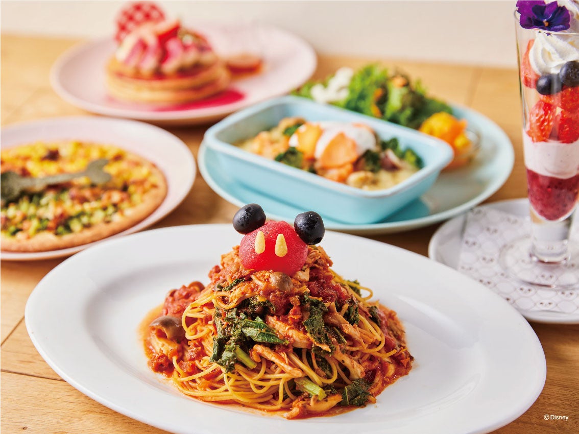 当店のメニューは全て、「4 STEPS for the FUTURE」をテーマに、「どのような素材を、どのように選び、どのように提案し、どのような体験を通じて提供するか」にこだわり、信頼がおける食材を、カロリー・塩分・脂質などに配慮した調理法でご提供いたします。メニューには、ミッキーマウスやミニーマウスをはじめとするキャラクターの世界観やストーリーを反映し、大人も子供もお楽しみいただけるデザインを施しています。「おいしさ」と、ディズニーの世界観を通じた「楽しさ」を掛け合わせた食体験をご提案いたします。これらのスペシャルメニューをはじめ、当店のメニューは全て、ディズニーが提唱する「カロリー600kcal以下」「塩分2.5g以下」「脂質30%以下(カロリーに対して)」「トランス脂肪酸0」など、バランスの良い栄養成分に関する基準を満たしたヘルシーな商品をご提供しています。