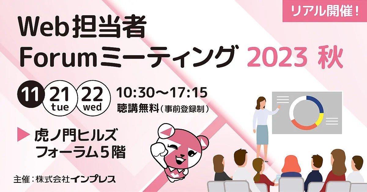 「Web担当者Forum ミーティング2023 秋」の概要は以下のとおりです。すべてのセッションに無料でご参加いただけます。主催である株式会社インプレスのWebサイトよりお申し込みください。