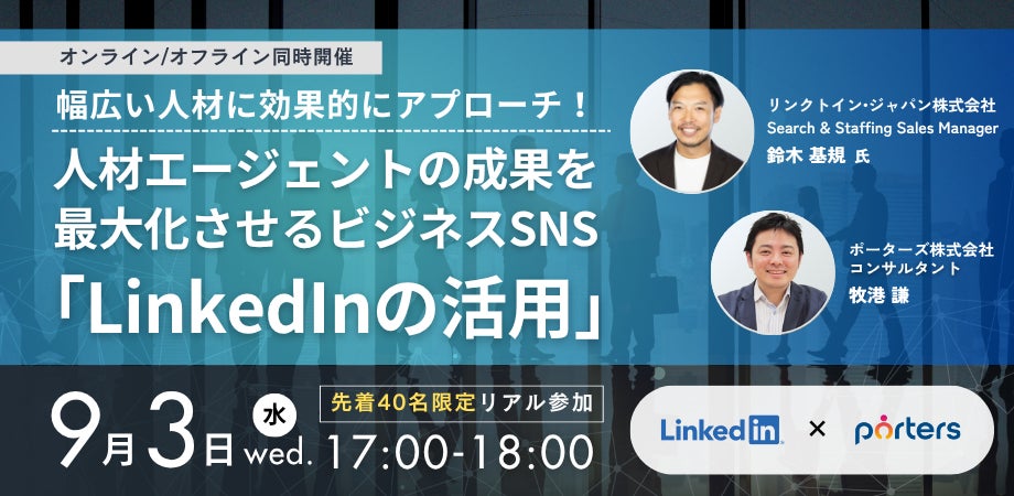 ■LinkedIn×PORTERS共催セミナー■『幅広い人材に効果的にアプローチ!人材エージェントの成果を最大化させるビジネスSNS「LinkedInの活用」』をハイブリッドで開催