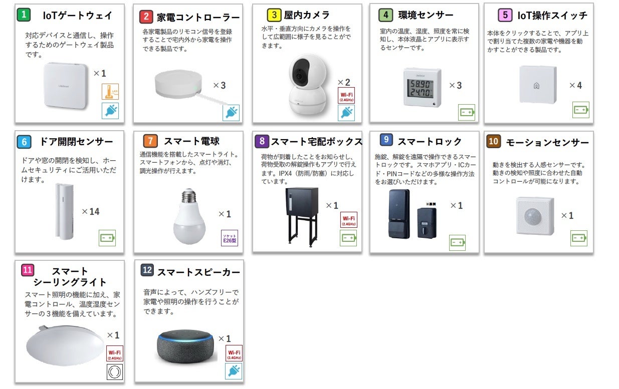実証実験を行う既存戸建住宅に導入した「SpaceCore」のスマートホーム機器は次の12種類となります。