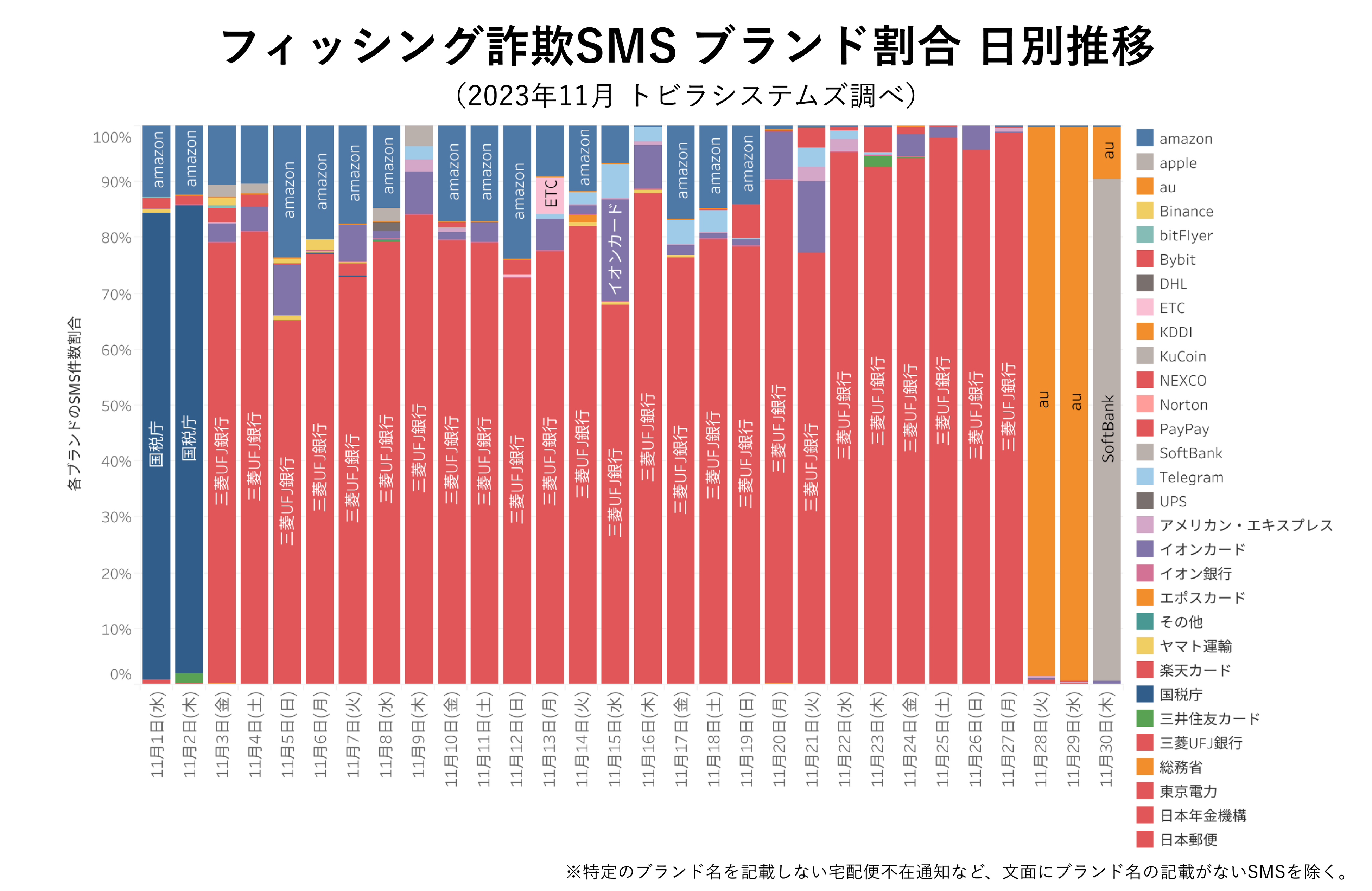 11月は三菱UFJ銀行をかたる文面が目立ったのち、下旬に「au」「SoftBank」などの通信事業者をかたる文面に切り替わる動きが見られています。引き続き通信事業者をかたるフィッシング詐欺にも注意が必要です。