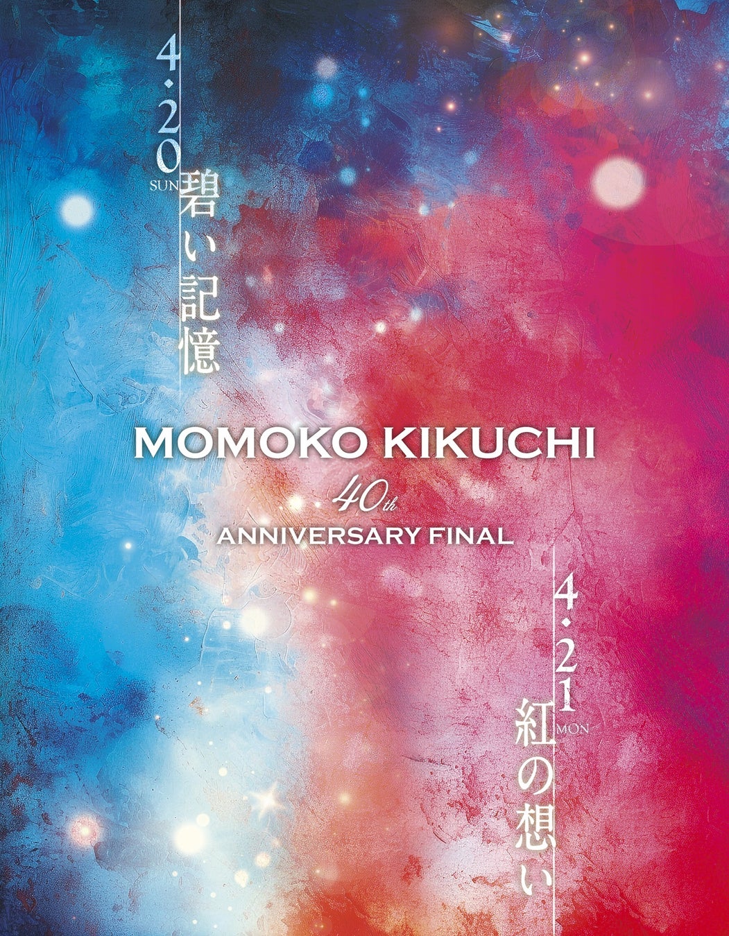 菊池桃子デビュー40周年の集大成として、2025年4月20日(日)/ 21日(月)に恵比寿ザ・ガーデンホールにて「MOMOKO KIKUCHI 40th Anniversary FINAL」のライブ開催が決定!1日目を「碧い記憶」、2日目を「紅の想い」とそれぞれ題しており、2日目の4月21日は40年前に菊池桃子のデビューシングル「青春のいじわる」が発売された日にあたる。