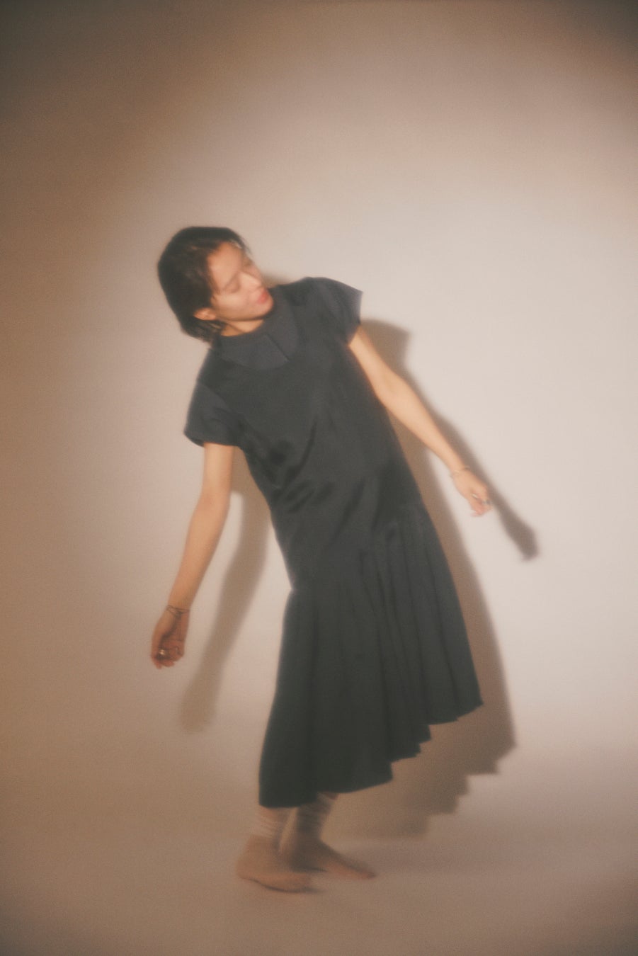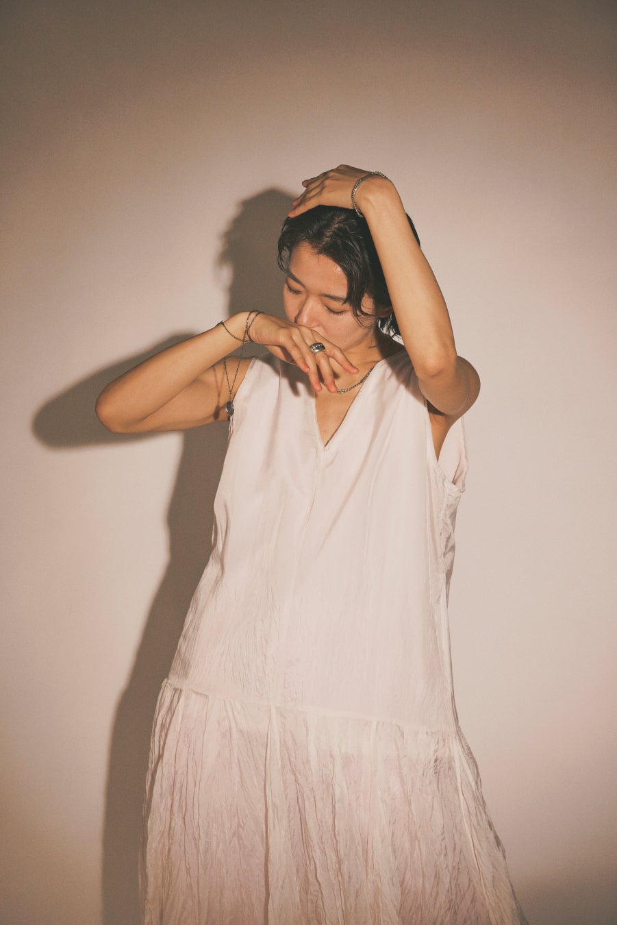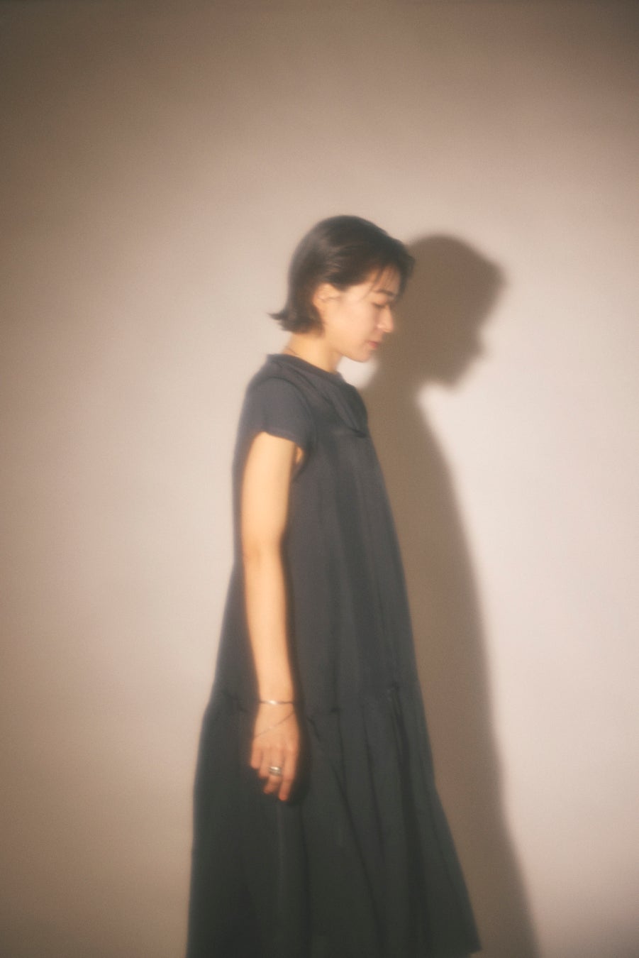 ネックは前後でUとVの両面使いが可能で、トップス部分にはコットンカットソーのライナー付き。裾を切り替えて着用すれば、スカート部分のみをペチコートとして使うこともできます。また、裏返すことでサテン地のキュプラ面を表に出し、より艶やかなワンピーススタイルにも変化。計6通りのスタイリングが可能な、機能美と詩情を兼ね備えた一着です。