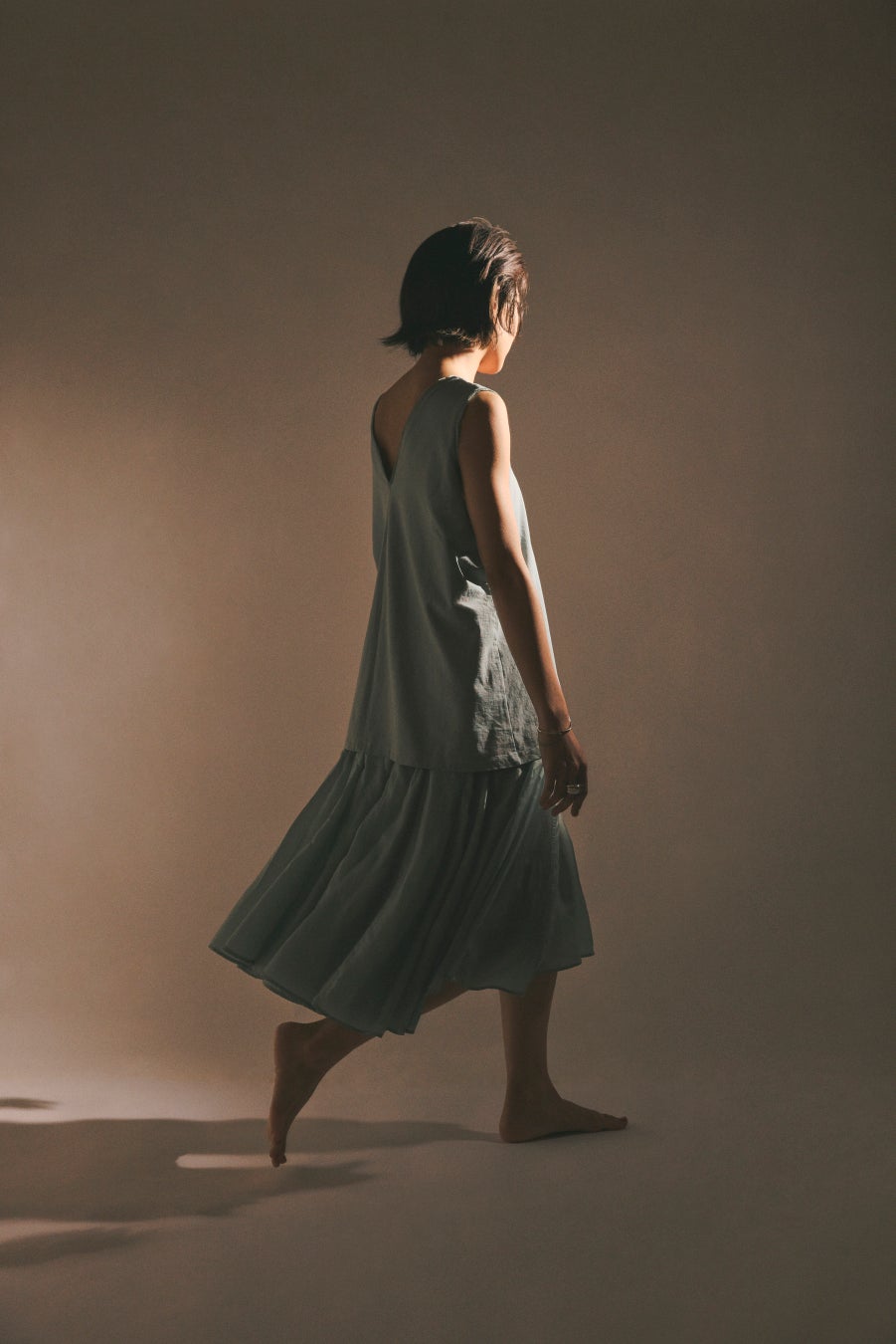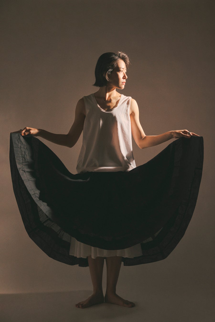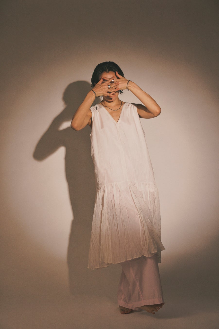 ネックは前後でUとVの両面使いが可能で、トップス部分にはコットンカットソーのライナー付き。裾を切り替えて着用すれば、スカート部分のみをペチコートとして使うこともできます。また、裏返すことでサテン地のキュプラ面を表に出し、より艶やかなワンピーススタイルにも変化。計6通りのスタイリングが可能な、機能美と詩情を兼ね備えた一着です。