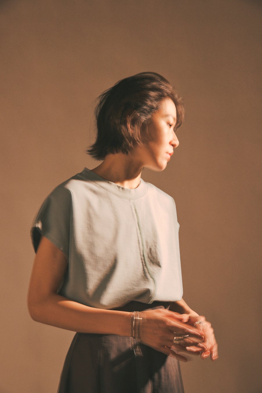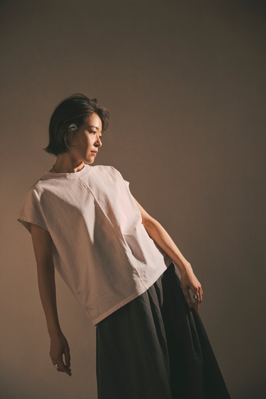 インナーとしての実用性を大切にしながらも、一枚で着る際にもしっかりと“かたち”がある。「フムス」が考える“美しい基盤”のバランスを追求したTシャツです。モックネックのように高さを持たせた襟ぐりは、ぴたりと詰まりすぎず、サマーニットのような品のある仕上がりに。フレンチスリーブの袖は、シャツや羽織の下でももたつかず、快適な着心地を保ちます。