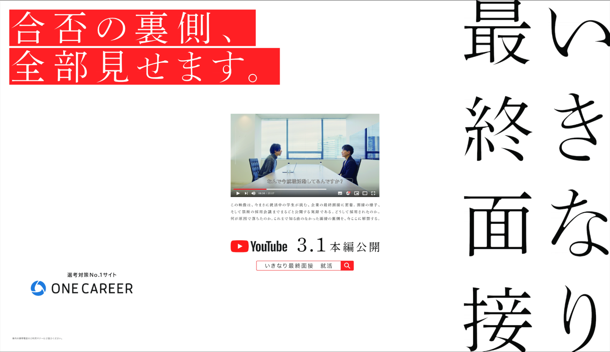 ワンキャリア、最終面接と採用会議に密着した禁断の就活ドキュメンタリー「いきなり最終面接」を3月1日に解禁。公開に先駆け、駅内広告とティザーサイトを2月27日より公開。