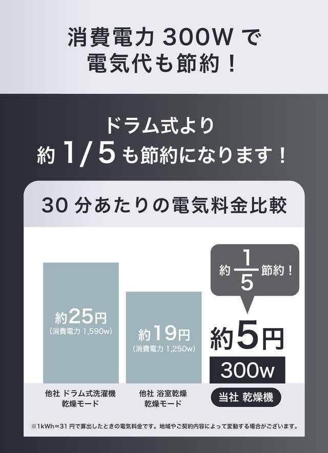 消費電力はわずか300Wで、ドラム式洗濯機や浴室乾燥機の乾燥モードと比較して電気代を約1/5 に削減。経済的で環境にも優しい設計です。