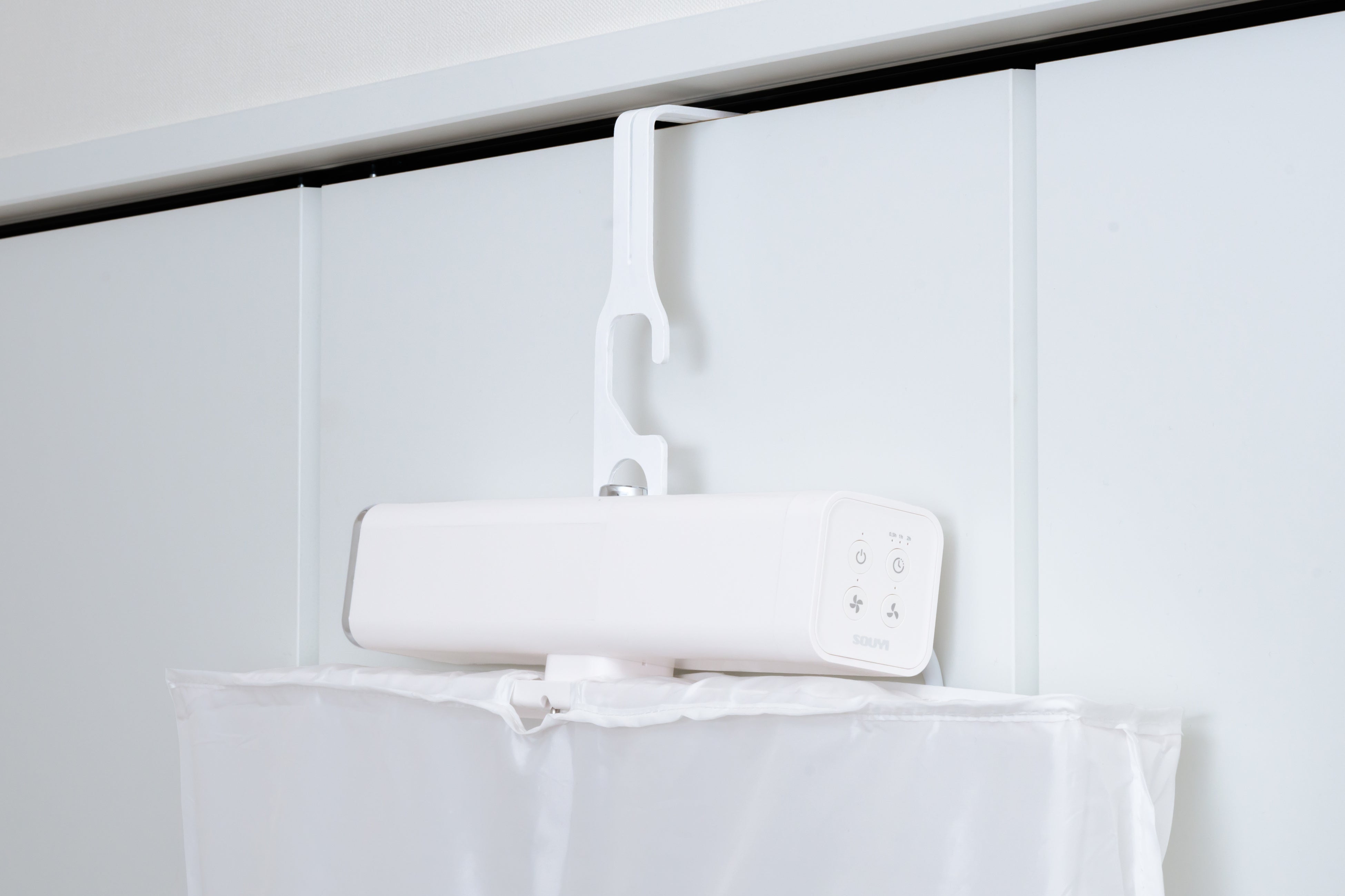 狭いスペースでも使いやすい「360°回転フック」を搭載。ドアの厚みにも対応できる「2in1フック」で、さまざまな場所に簡単に設置できます。折りたたみ衣類ラックや専用カバーを使えば、省スペースながら効率よく乾燥可能です。